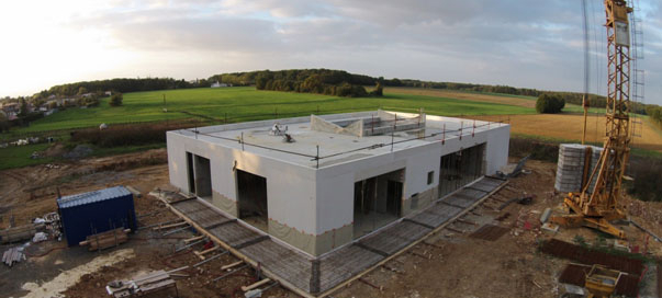 Travaux de construction d’une maison de l’enfance de 450 m2 de surface de plancher. Les parties visibles sont en béton blanc banché et les parties non visible en béton gris banché.